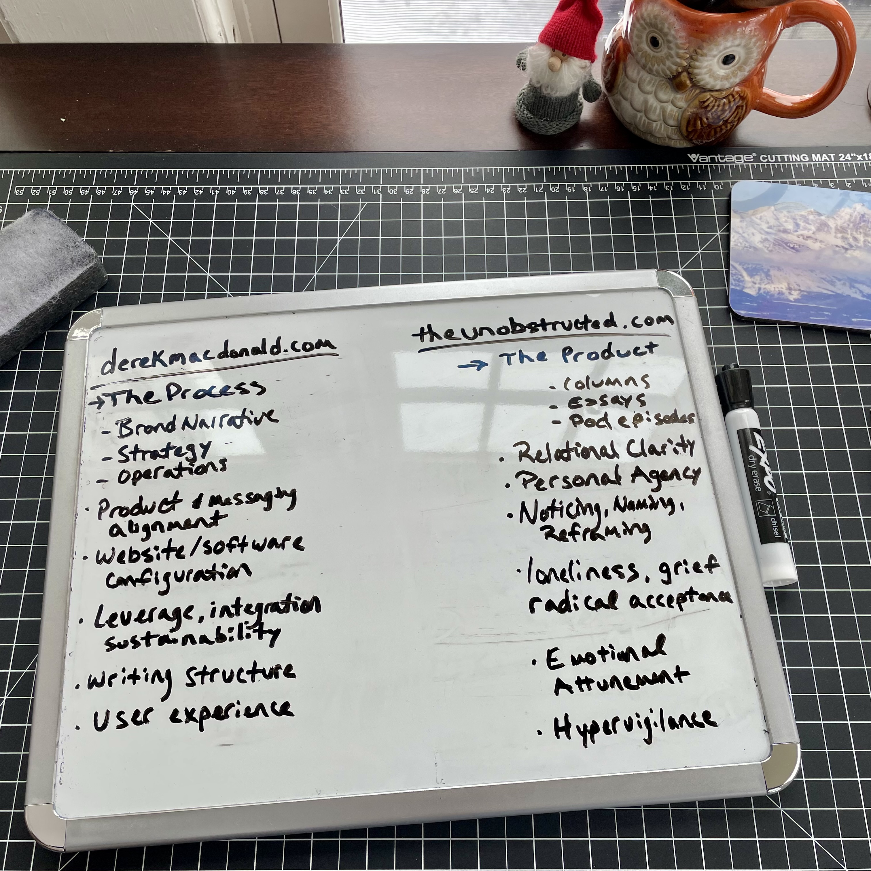I’m still figuring out exactly what that means, but I think it means derekmacdonald.com is the container for Process and theunobstructed.com is the container for Product(s). At least, that’s what my mini whiteboard brainstorm revealed. So, I re-worked the backend infrastructure of derekmacdonald.com to support a blog, separate from my daily column or my essays.
