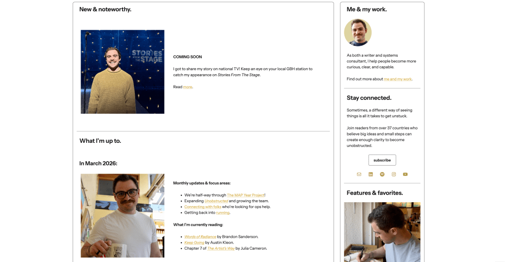 Today, I stopped to look back on my journey. And I was able to do that because it’s all out in the open, cleanly separated between process and product on derekmacdonald.com and theunobstructed.com. Best of all, my personal site now feels like me. It has RSS feeds of my daily column, substack essays, and podcast episodes (and links for folks who want to subscribe). And it has a blog just for the process stuff.